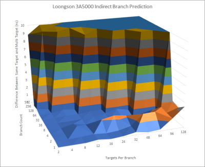 通往多個目標的分支更難,因爲分支預測器也要在分支目標之間進行選擇。這些棘手的分支也被稱爲間接分支,因爲它們告訴 CPU 跳到寄存器中的一個地址,而不是直接編碼目標。對於一個間接分支,3A5000 在遇到懲罰(可能是錯誤預測)之前可以跟蹤大約 24 個目標。我們看到,在 256 個分支和每個分支兩個目標的情況下,總共跟蹤了約 512 個間接目標,而沒有受到明顯的懲罰。