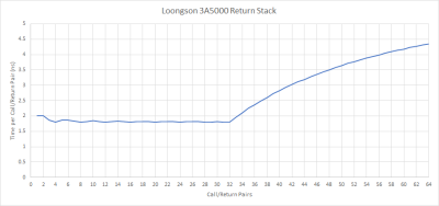 返回是間接分支的一種特殊情況,因爲它們通常出現在匹配的調用/返回對中。因此,許多 CPU 保留了一個返回地址的堆棧。在調用時,它們將一個地址推到堆棧上。爲了預測一個返回,他們從堆棧中彈出一個地址。龍芯爲 3A5000 提供了一個 32 個入口的返回堆棧,這對於絕大多數情況來說應該是足夠的。這比 GS464E 有明顯的改進,GS464E 有一個 16 條目的返回堆棧。