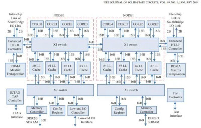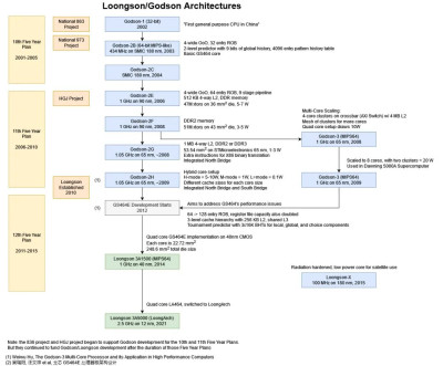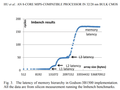 Godson-3B1500 在 1.25 GHz 核心和 1 GHz LLC 時鐘下的延遲結果,發表在《32/28 納米 Bulk CMOS 中的 8 核 MIPS 兼容處理器》,IEEE 2014 年