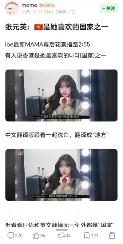 標題:張員瑛稱香港是最愛國家慘遭出徵!中國粉絲爆氣:搞分裂、IVE滾