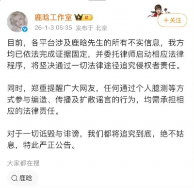 鹿晗工作室緊接著在清晨5點發布公告,表示針對各平台的不實訊息,已完成證據固定,將透過法律途徑追究到底,並警告網友停止傳播謠言。隨後,包括林更新、黃明昊、檀健次以及被捲入緋聞的王安宇、關曉彤,皆全數否認爆料內容。