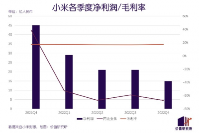四季度小米經調整淨利潤約爲15億元,同比下滑67.3%,市場預期爲13億。比起營收,小米淨利潤的跌幅更加嚴重,且同樣連續四個季度下滑。這也跟小米堅持高性價比路线、產品毛利率偏低有直接關系。