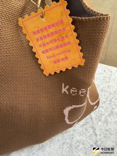 這款深褐色的針織手提袋設計相當精緻且環保,上方掛著印有「謝謝光寧」與愛心圖案的吊牌。袋身中央繡有標誌性的眼鏡圖騰,象徵著林光寧生前的招牌形象,搭配「Keep smiling」(保持微笑)的英文字句,像是他最後留給親友們的溫柔叮嚀,期望大家別太傷心,要繼續快樂地生活。