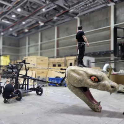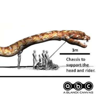 從曝光的照片可以看出,30公尺巨蟒是機械工程與藝術雕塑的結合。蛇頭從灰模粗胚的細緻雕琢,後期手工上色、繪製出逼真鱗片光澤,每一步驟都有繁複工序。內部的精密構造是透過特製的機械底盤與支架支撐,使其具備靈活的動態機能。照片中可見工作人員直接站立於蛇頭之上進行測試,證明其結構能穩固地支撐表演者,有極高水準的工藝技術。