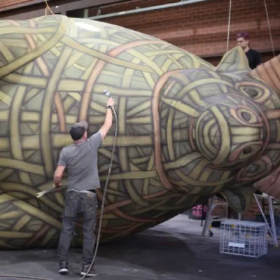 雖然主體是龐大的充氣結構,但製作團隊卻未忽略任何細節。藝術家們架著梯子,以手工噴繪的方式在表面繪製出仿若藤編與木質的紋理,賦予了它古老而神祕的質感。設計圖也揭示巨蟒和公牛運作的方式,原來都需要多位操偶師和推動者在底部協同合作,才能賦予它們生命力。