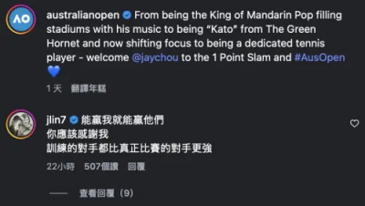 除了與林書豪切磋球技外,周傑倫近期也被目擊與台灣網壇新生代代表人物曾俊欣對打,年僅24歲的曾俊欣被視為台灣現役「球王」等級選手,長期徵戰國際賽事,實力與經驗兼具,周傑倫能與這樣層級的職業選手實際交手,也被外界解讀為他對澳網挑戰的重視程度遠超一般表演活動,訓練強度與對手水準都直逼專業等級。