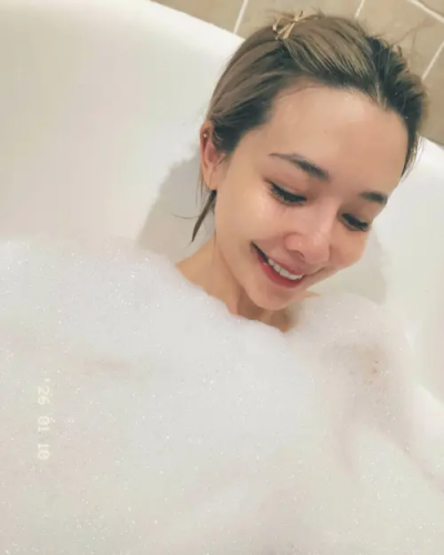 從照片中可見,吳婉君將長髮盤起,整個人浸泡在浴缸之中,細緻泡泡自然遮擋身體線條,只留下鎖骨、肩頸與臉部輪廓,畫面既保有美感也不失分寸,她對著鏡頭露出甜美笑容,偶爾俏皮地玩起泡泡,讓整體氛圍顯得輕鬆又療癒。