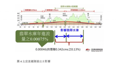 鐵道局2019年方案中,將採取新工法降低施工汙染,且隧道斷面較高速公路為小,減少相關影響。營運階段北宜直鐵不排水隧道影響翡翠水庫0.00046cms(立方公尺/秒),為目前雪山隧道之0.13%,翡翠水庫進水量之0.00075% 。