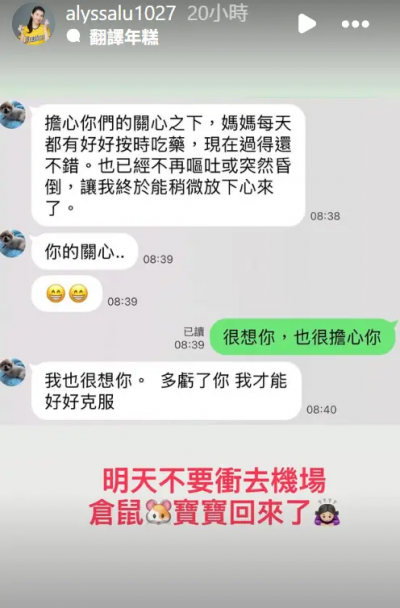乖姐昨日在IG限時動態中,曝光她與邊荷律的私訊內容,只見邊荷律表示,在大家的關心之下,媽媽的狀況已經好了許多,每天都有按時喫藥,已經不會再嘔吐或是突然昏迷了,「讓我終於能稍微放下心來了。」乖姐也安慰邊荷律:「很想你,也很擔心你」,邊荷律則堅強回應,「我也很想你。多虧了你我才能好好克服」。