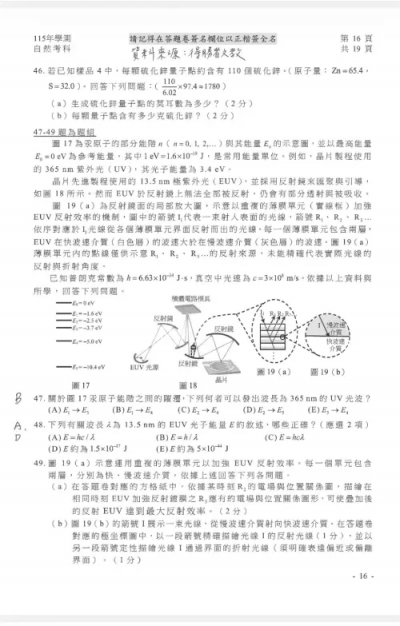 這份被比喻為「半導體人才先修」的題組,出現在自然科試題卷第16頁。題目背景設定在晶片先進製程,詳細描述了13.5 nm極紫外光(EUV)如何透過反射鏡匯聚與引導,並結合原子能階圖,題目要求學生不僅要會算能量,還要理解波速、反射與疊加效率。