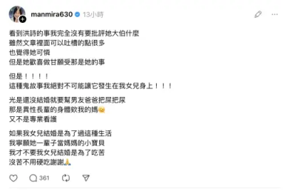 我是廣告 請繼續往下閱讀 洪詩發文澄清仍招罵 網紅潔哥寧可女兒不婚
