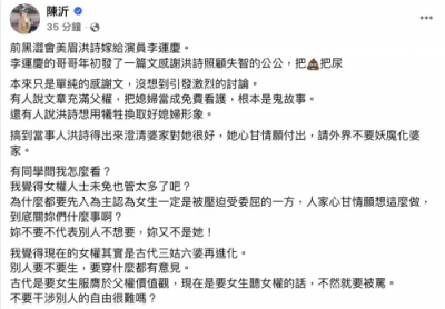 陳沂在臉書分析洪詩照顧公公的事件,許多人說洪詩大伯的文張充滿父權,把弟媳當成免費看護,根本是鬼故事,洪詩也跳出來澄清夫家對她很好,照顧老公的爸爸,不覺得特別偉大。
