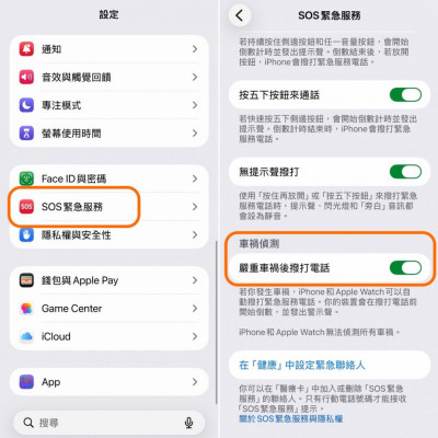 值得注意的是,這項功能在iPhone中預設為開啟狀態,建議用戶可自行檢查設定是否正確。只要進入「設定」→「SOS 緊急服務」,確認「嚴重車禍後撥打電話」已啟用;下方的緊急聯絡人資訊若尚未設定,也可一併補齊,關鍵時刻或許就能派上用場。