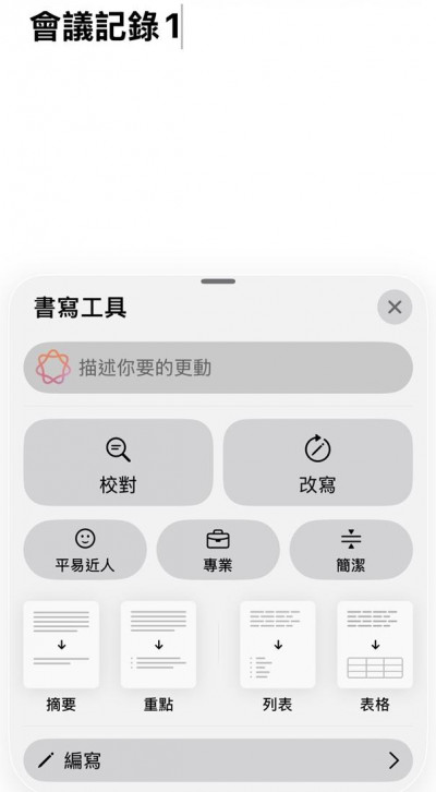 把逐字稿複製到備忘錄中,可進一步透過Apple Intelligence的「書寫工具」快速做出摘要或重點整理。