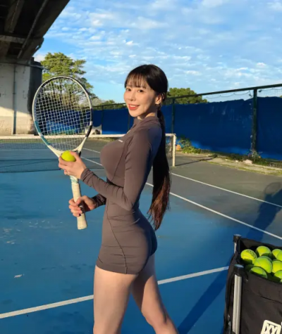曝光的照片,梓梓紮著乾淨長馬尾,穿一件極度貼身的運動衣於網球場擺拍,可見她前凸後翹的身材曲線一覽無遺,尤其是傲人上圍、零贅肉腰身和結實鉛筆腿,配上甜美、陽光的笑容,宛如運動雜誌封面。