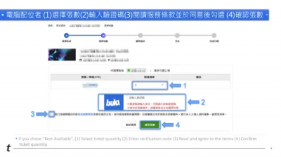 5.電腦配位者:(1)選擇張數(2)輸入驗證碼(3)閱讀服務條款並於同意後勾選(4)確認張數