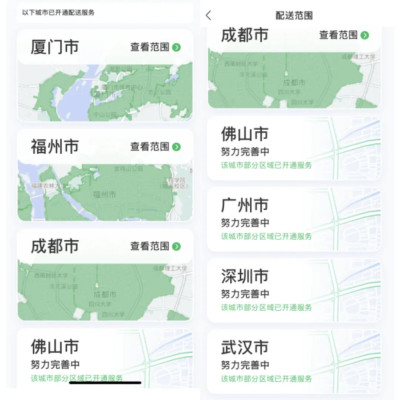 7年累計拓城7座,樸樸超市的整體發展並不快。不同城市還存在配送服務差異,如下圖所示,廈門、福州、成都三城擁有全城服務範圍,而其他四城僅部分區域擁有配送服務。