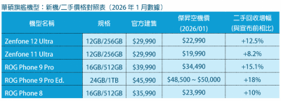 其餘機款方面,通路價格仍低於官方售價,不過二手回收價同樣迎來增幅,像是 Zenfone 12 Ultra 增加了 12.5%,就連前一代的 Zenfone 11 Ultra 與 ROG Phone 8 也有最高 10% 回升。數據指出,2025 年 12 月華碩二手機的回收價格平均增加 7%,在 2026 宣布淡出市場後,價格已突破 12%。
