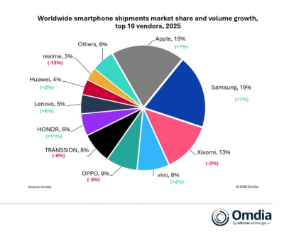數據指出,蘋果去年以 19% 的市佔率、出貨量突破 2.4 億台穩居第一,年增 7%,主要歸功於 iPhone 17 強勁的需求帶動,在中國市場成長率更達 26%。三星則終於止跌回升,同樣年增 7%,市佔率與蘋果旗鼓相當,均為 19%,僅在出貨總量上稍微遜色。