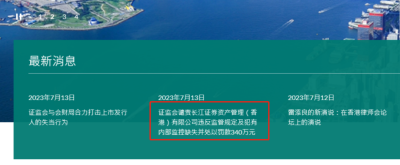 7月13日,香港證監會官網消息顯示,香港證監會譴責某證券資產管理(香港)有限公司,並處以罰款340萬港元。