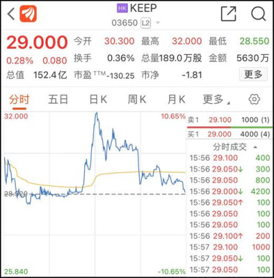 Keep的發行價定爲28.92港元,上市首日高开4.77%,報30.3港元,午後盤中一度跌破發行價,最終報29港元,上漲0.28%。