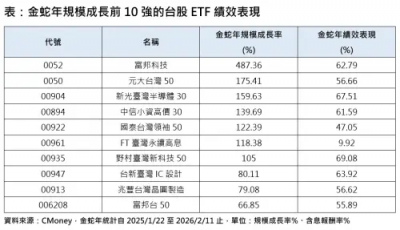 標題:金蛇年台股ETF規模成長10強出爐!7檔半導體、科技ETF超吸金