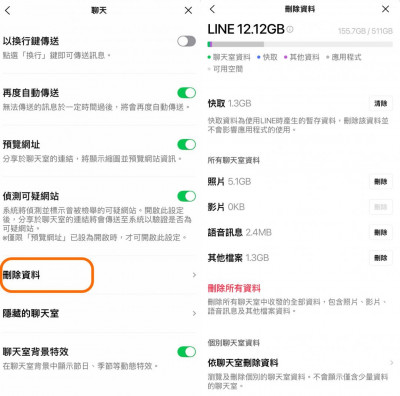 ● 步驟操作:進入LINE App → 主頁 → 設定 → 聊天 → 刪除資料 → 依聊天室刪除資料→ 選擇指定聊天室 → 再分別勾選要刪除的照片、影片、語音或其他檔案。