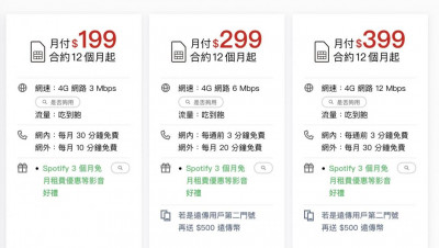 ● 通話優惠:網內免費30分鐘/網外免費10分鐘、市話每秒0.1元,贈送Spotify免費3個月