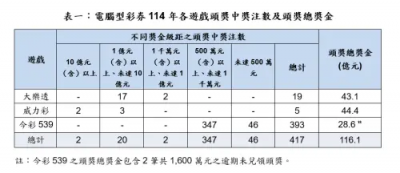 ▲電腦型彩券114年各遊戲頭獎中獎注數及頭獎總獎金。(圖/台灣彩券公司提供)