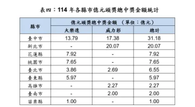 若以這22注億元頭獎的中獎金額進行統計,在10個縣市中,排名全國前3名的縣市分別為台中市(31.18億元)、新北市(20.07億元)和花蓮縣(7.92億元),合計總中獎金額達59.17億元,佔全國22注億元頭獎獎金總額85.61億元的近7成。