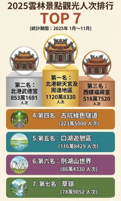 據觀光署近期公布的2025年1至11月景點觀光人潮統計數據,雲林縣最強景點確定由「北港朝天宮」奪下,當地在11個月之間吸引1120萬人次香客,第二名則是台灣五路武財神的發源地「北港武德宮」,其餘雲林景點排名如下: