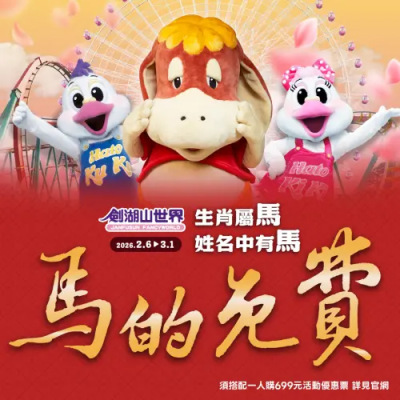 迎接 2026 金馬年,劍湖山世界祭出超強企劃!自 2 月 6 日至 3 月 1 日,凡姓氏為「馬」、生肖屬馬,或姓名中含有「馬」字部首的民眾,只要出示證件並搭配一名購買 699 元門票的親友,即可享本人免費入園優惠!此外,指定通路更推出「699 元優惠票買二送一」方案,讓親朋好友揪團更劃算。
