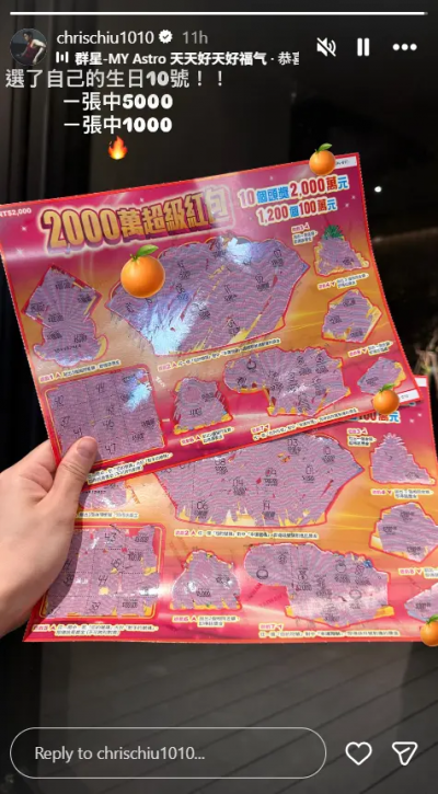 我是廣告 請繼續往下閱讀 邱宇辰昨(19)日在IG限時動態上傳手拿兩張刮刮樂的照片,10月10日生日的他,以數字10選擇兩張尾數10的「2000萬超級紅包刮刮樂」,居然一張中5000元,另一張中1000元,相當幸運。