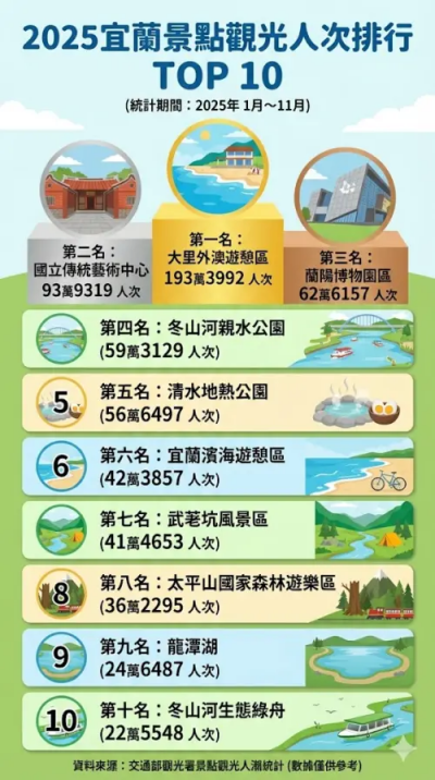 據觀光署近期公布的 2025 年 1 至 11 月景點觀光人潮統計數據,宜蘭縣最強景點確定由位於頭城的「大裏外澳遊憩區」奪下冠軍,在 11 個月間吸引 193 萬人次遊客;第二名則是「國立傳統藝術中心」,11 個月湧入 93 萬人次,其餘宜蘭景點排名如下: