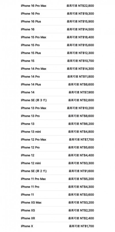 蘋果定期會更新Trade In換購方案,根據最新價目表顯示,目前提供29款iPhone可參與折抵,範圍從iPhone 16 Pro Max到iPhone X都在列;不在名單內的機型,通常也代表蘋果認定已無剩餘價值。