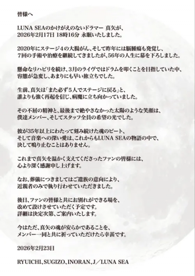 LUNA SEA官方表示,後續將安排追思空間供粉絲道別。聲明最後強調:「此刻若能與我們團員一同祈願真矢的靈魂安息,將是我們最大的欣慰。」