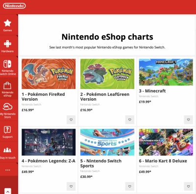 縱觀美國、英國、日本及澳洲的 eShop 銷售榜,預計 2 月 27 日正式上線的《寶可夢 火紅/葉綠》均已攻佔排行榜前兩名。多數玩家明顯偏好以噴火龍為封面的《寶可夢 火紅》,使其普遍穩坐冠軍,其次才是以妙蛙花為首的《寶可夢 葉綠》,其銷量甚至超越《Minecraft》、《瑪利歐賽車 8 豪華版》及《寶可夢傳說 Z-A》等熱銷大作。