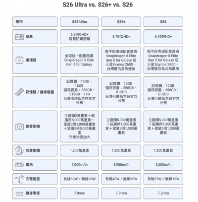 標題:三星S26、S26+、S26 Ultra怎麼挑?硬體規格差異一表看懂