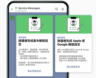 為確保用戶已經將 LINE 帳號已經完成基本綁定與設定,LINE 即日起會透過「Service Messages」官方帳號發出提醒通知,只要有收到就代表帳號綁定還不完整,需要盡快設定。