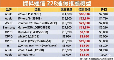 如果瞄準Android手機,傑昇促銷主打機型還包含三星S25(12GB+256GB)與華碩Zenfone 12 Ultra(12GB+256GB)等。外界普遍認為,新一代S26系列的升級火力同樣聚焦在S26 Ultra,反而讓上一代的S25、S25+成為價格與性能兼顧的選擇。