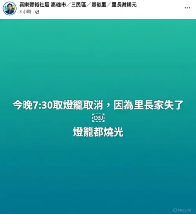 裏長事後在臉書公告,原訂晚間7時30分的提燈發放活動取消,並說明因住家失火,燈籠已全數燒毀。確切起火原因仍待消防單位進一步釐清。