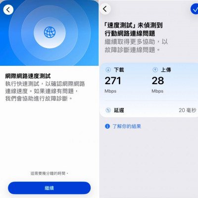 在「Apple支援」中,可進行網速測試。(圖/翻攝App)