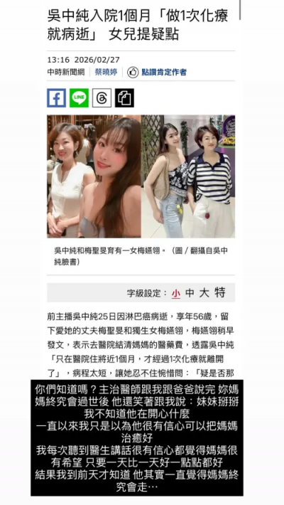 標題:吳中純罹癌驟逝!愛女心碎曝光醫病溝通落差:一直以為有希望治癒
