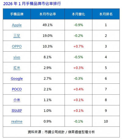 2026年1月手機品牌銷量市佔率排行。(圖/傑昇)