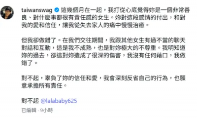 回顧整起事件,Tommy日前在社群上公開向LaLa道歉,表示「在我們交往期間,我跟其他女生有過不當的聊天對話和互動,這是我不成熟,也是對妳極大的不尊重」,坦承對女生造成了很大的傷害,會深刻反省自己的行為,也願意承擔所有責任。