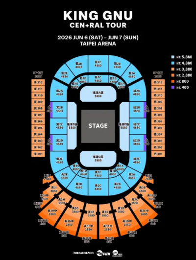 King Gnu台北小巨蛋演唱會全場採實名抽選制,於今日下午5點(17點)至3月8日下午5點開放在Ticket Plus遠大售票登記抽票;票價共有5種:5880元、4880元、3880元、2880元、800元,歌迷可在登記頁面視經濟能力選擇心儀的價錢來選擇,每個證件號碼每場僅能登記1張票券;而抽選結果將於3月10日中午12點起透過E-Mail、簡訊通知,中選者須於3月11日中午12點前完成繳費才算訂單成立,若是未在時間內付款完者,中選的門票將會流回票池,用於下一階段販售。