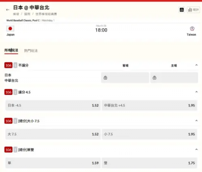 我是廣告 請繼續往下閱讀 根據台灣運彩最新盤口,本場未開出不讓分玩法,讓分盤為日本讓4.5分(賠率1.52),中華台北受讓4.5分(賠率1.95);總分盤為7.5分,大分賠率1.52、小分1.95。盤面顯示莊家明顯看好日本能以大比分差距取勝。