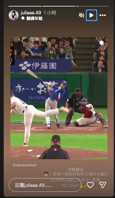 陳晨威與捷克的比賽雖未揮出全壘打,但強而有力的高飛犧牲打也助攻中華隊得分,讓啾啾開心直呼:「好棒棒!今天差一點點。」中華隊明日將對上宿敵韓國,啾啾也替陳晨威加油,可說是他的最強後盾。