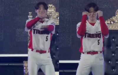 我是廣告 請繼續往下閱讀 金倒永繼之前被翻出穿女裝模仿Hanni表演〈藍色珊瑚礁〉後,又被挖出曾在舞台上穿著起亞虎球衣,大跳Rosé的〈APT.〉影片。只見他面帶笑容,左右跳來跳去的做出雙手交疊的招牌舞蹈,以及可愛的扭腰、頂髖動作。雖然金倒永的表情看起來有點羞澀,但整個人感覺非常享受其中,看起來充滿喜感又歡樂。