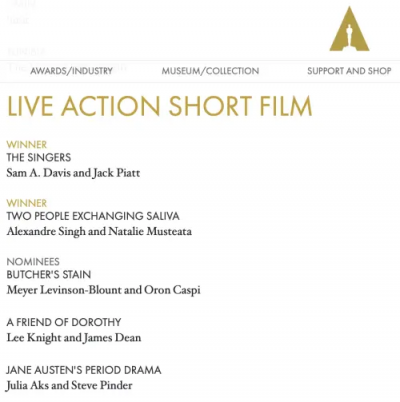 本屆最佳真人短片入圍名單包含《The Singers(歌手)》、《Two People Exchanging Saliva(交換唾液的兩個人)》、《Butcher's Stain(屠夫的污漬)》、《A Friend of Dorothy(桃樂絲的朋友)》以及《Jane Austen's Period Drama(珍奧斯汀時代劇)》,由於多部作品在影展期間評價不俗,頒獎前就被外界認為是競爭相當激烈的一個獎項,沒想到最終結果出現並列得獎,成為奧斯卡史上第七次出現平手的情況。